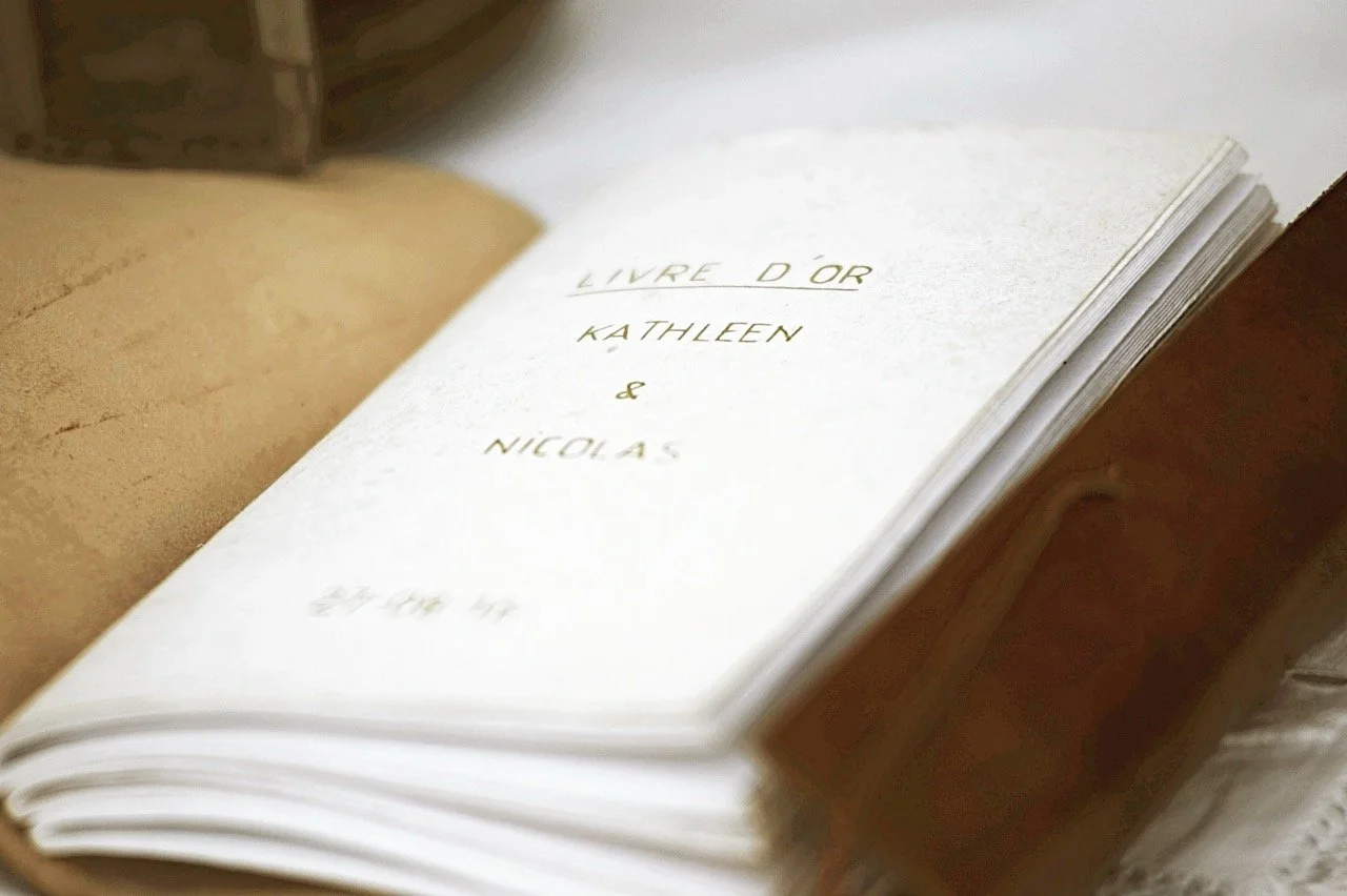 Pour que nos invités puissent nous laisser un petit mot, on a trouvé un livre d’or en cuir, avec du papier épais, à l’ancienne. Pas d’imprimé, pas de gadget numérique : juste un bel objet intemporel, que l’on prend plaisir à relire encore aujourd’hui.