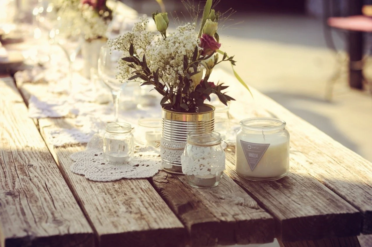 Des conserves métalliques : qu’on a décorées avec de la ficelle, de la dentelle, du papier kraft pour en faire des pots ou photophores.