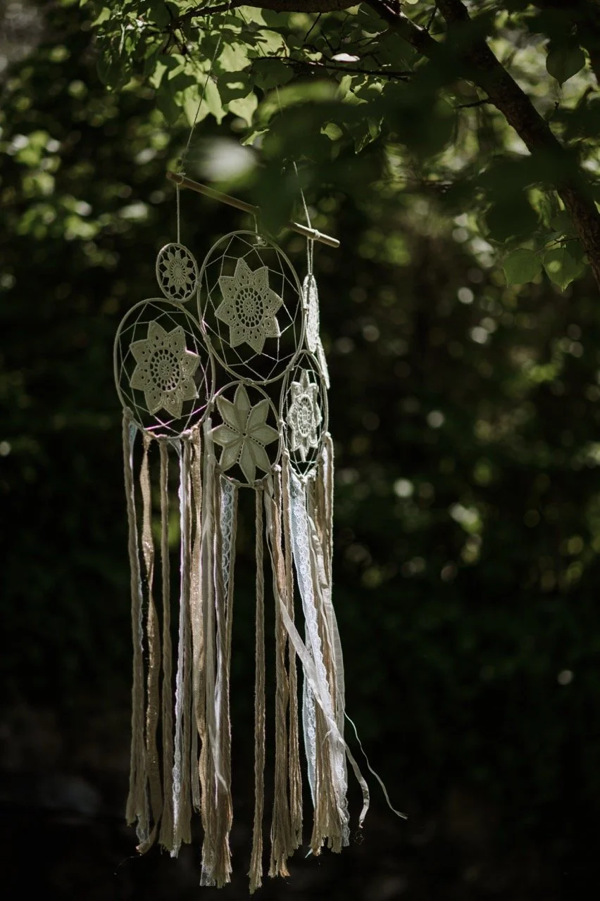 Elle a chiné la majorité des éléments déco chez Emmaüs : napperons anciens, draps, bocaux en verre, dreamcatchers… Tout était pensé avec soin.