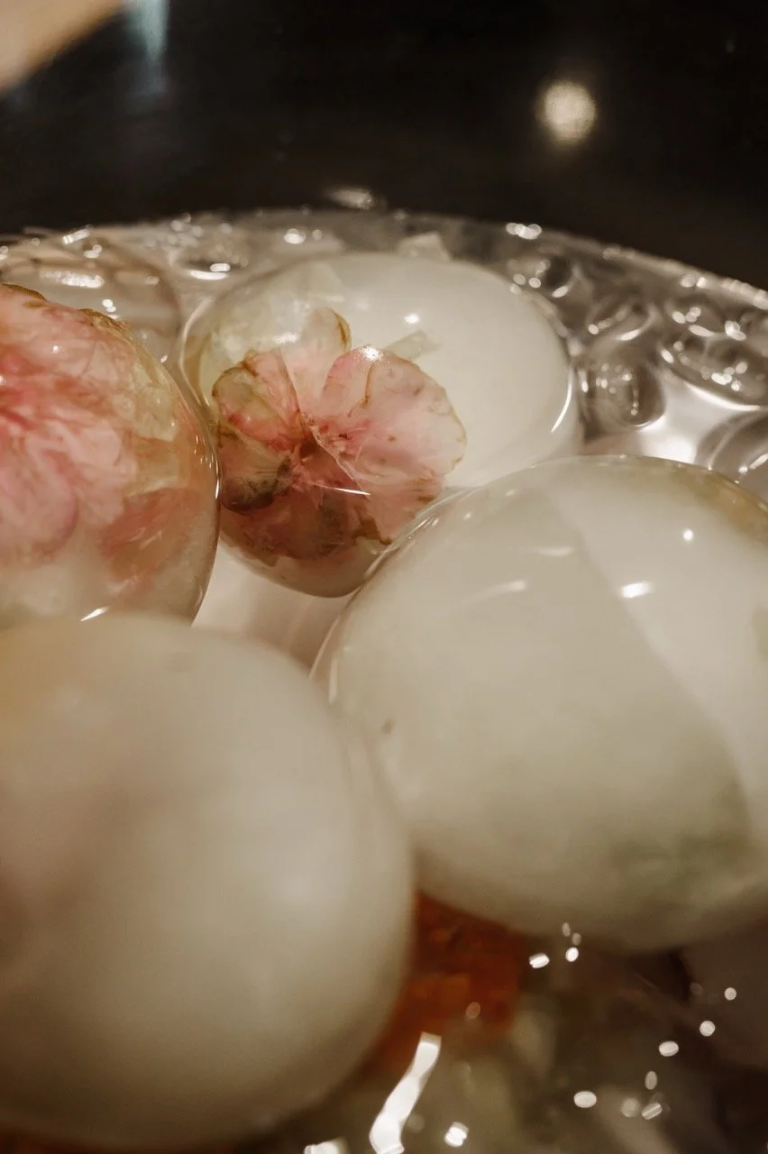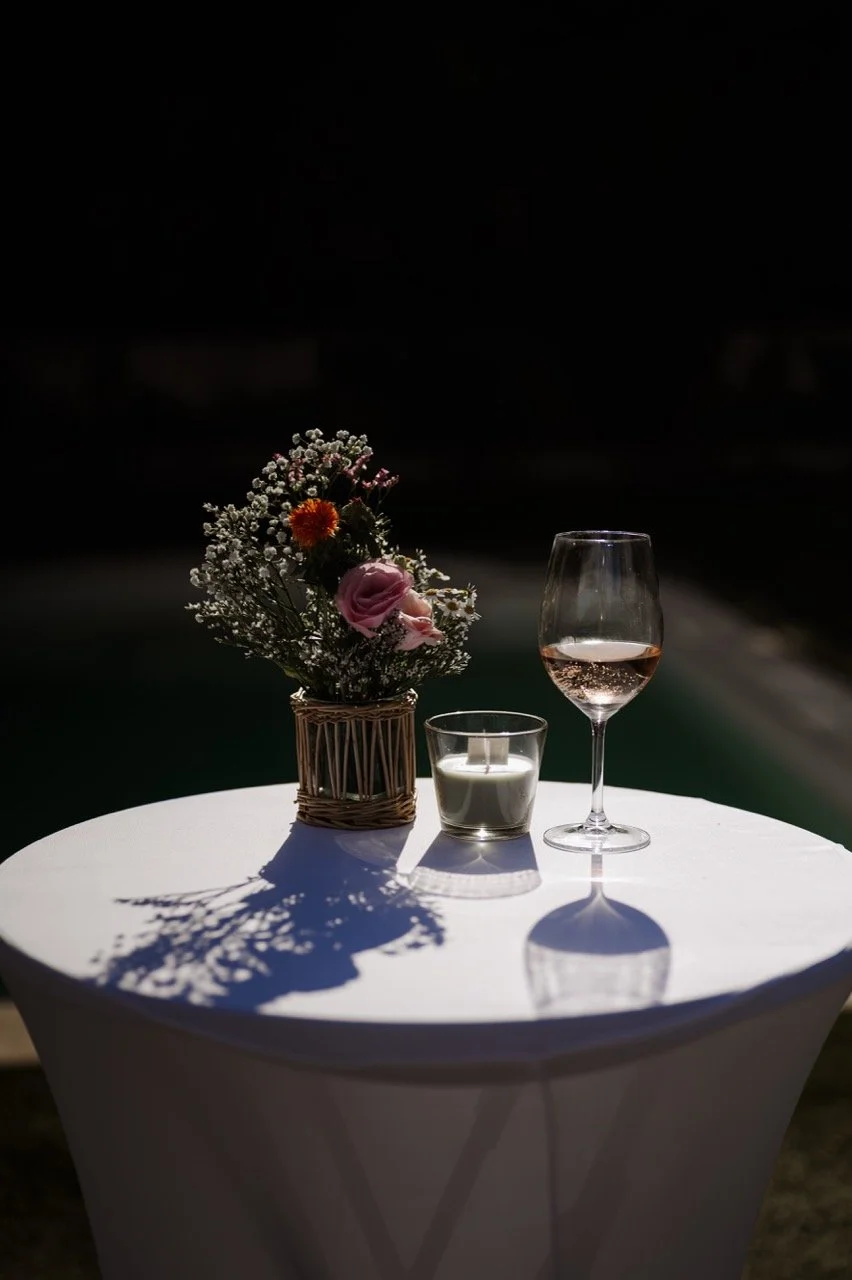 – Le jeu de lumières entre les verres, les fleurs suspendues et les guirlandes, créant une atmosphère magique.