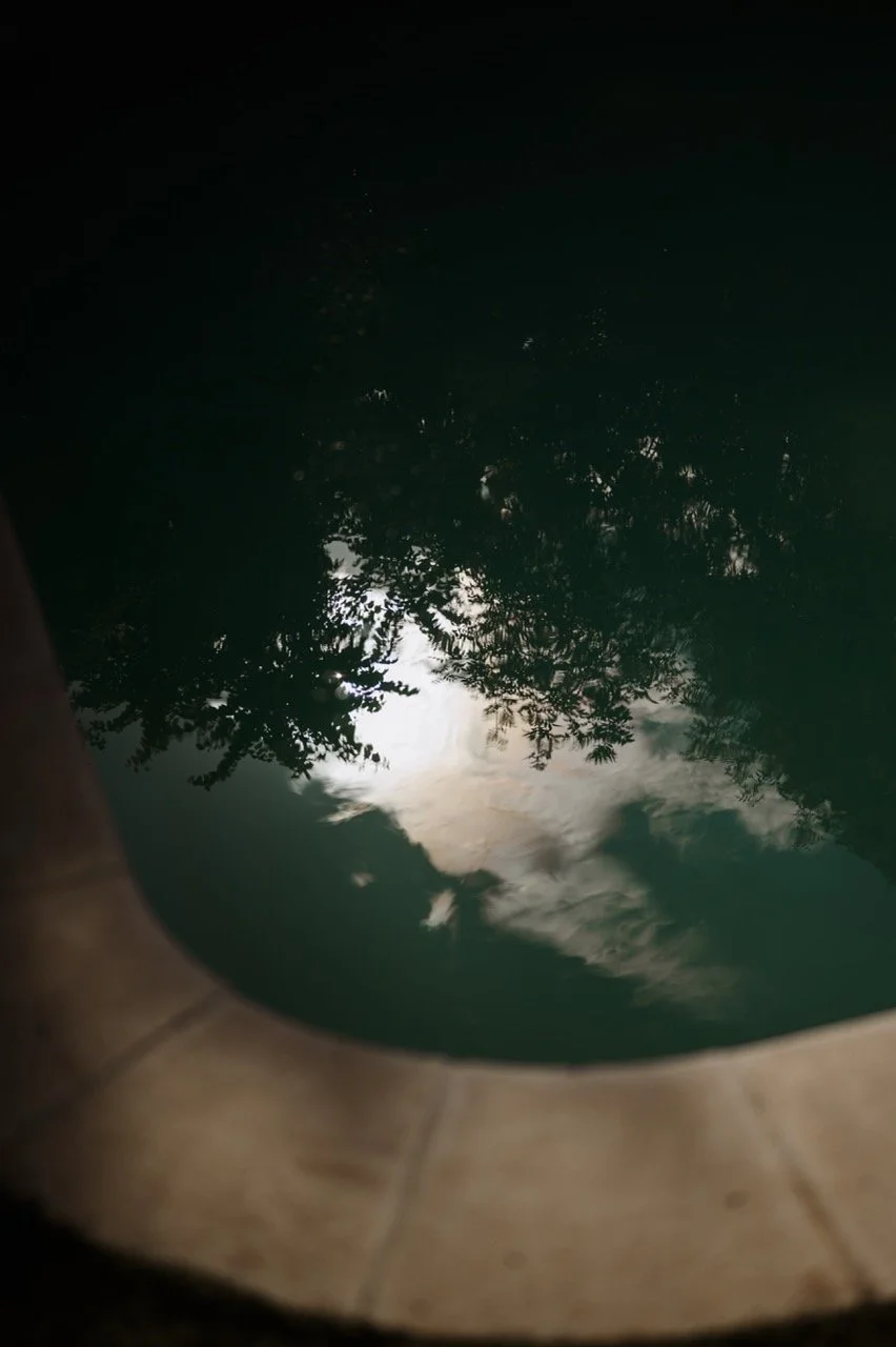 – Les reflets mouvants dans la piscine, qui mêlaient les silhouettes des invités à la lumière du ciel.