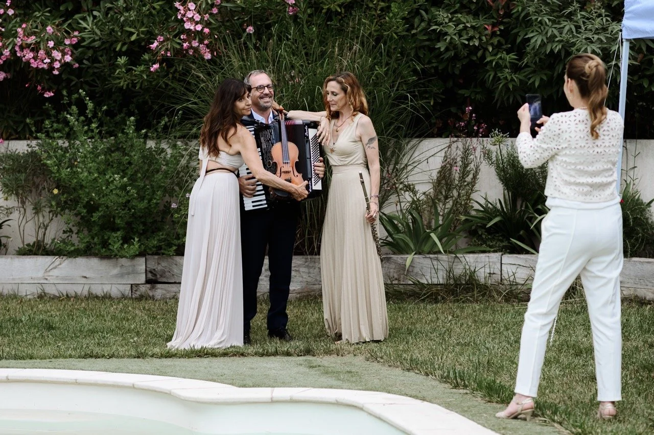 Un petit groupe de musiciens présents pendant le vin d’honneur a ajouté une touche festive et chaleureuse à ce mariage fait-main, extrêmement touchant.