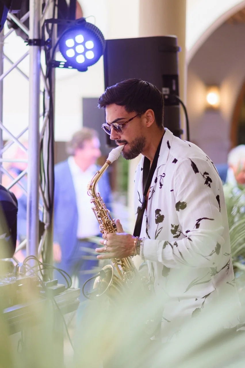 De retour à la villa, le cocktail a commencé au bord de la piscine, avec un saxophoniste live qui a mis tout le monde dans l’ambiance.